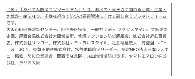 あべてん防災コンソーシアムは、防災月間である9月に合わせて、防災について学び、備えることを目的とした防災イベント「あべてんBOSAIスイッチ」を初開催します。あべの・天王寺で防災の課題解決に取り組む企業や団体で構成される「あべてん防災コンソーシアム」が主催し、地域の皆様が協力して企画・運営するイベントとなっています。「あなたの防災意識にスイッチ!」を合言葉に、地域の方はもちろん遠方からあべのハルカスにお越しになったお客さまにも、防災について考えるきっかけとなればという想いから開催にいたりました。