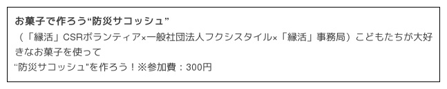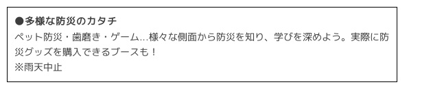 『今、ここで南海トラフ地震が起きたら?』をテーマに、地震発生から避難所や帰宅困難時の各シーンをイメージしてイベントを構成しています。各会場では、防災サコッシュの製作や水消火器体験、防災グッズの販売など、防災に関するワークショップなどを開催します。各イベント、ワークショップはスタンプラリー形式となっており、ご参加いただいた方には、協賛企業に提供いただいた物資(非常トイレ、パックごはんなど)を配布します。