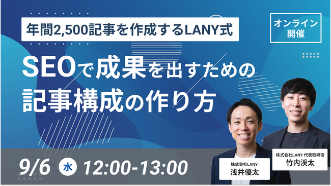 【無料ウェビナー】年間2,500記事を作成するLANY式 SEOで成果を出すための記事構成の作り方を解説するウェビナーを9/6(水)に開催