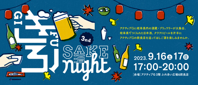 アクティブG (岐阜県岐阜市) では、2023年9月16日(土)・17日(日) の2日間、岐阜県の地酒・クラフトビールと飲食店の料理を堪能できるイベント『ぎふSAKE night 3rd』を開催いたします。