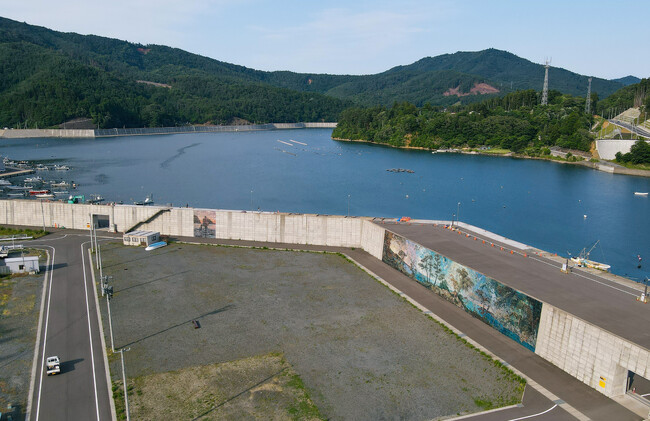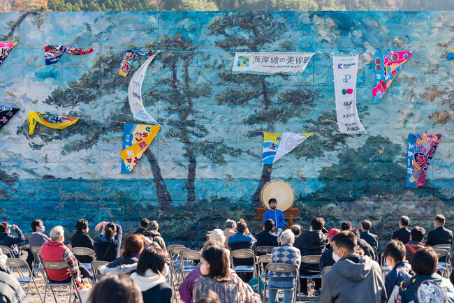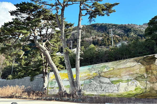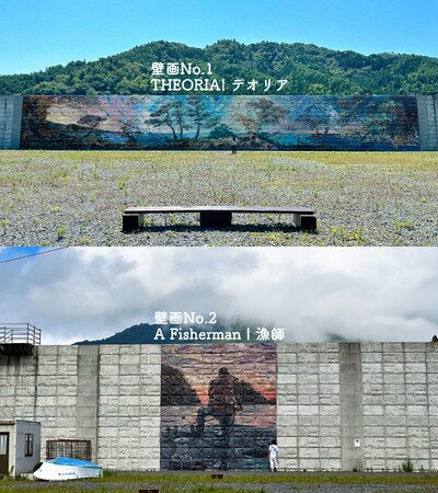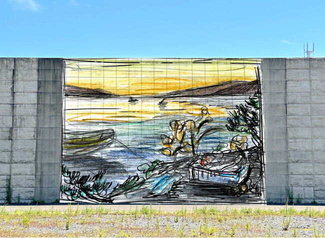 「海岸線の美術館」は2022年11月に宮城県石巻市雄勝町に誕生した野外美術館です。2011年に発生した東日本大震災後に海岸線を囲うように建設された、高さ最大10m、全長約3.5kmの巨大な灰色の防潮堤の壁面に壁画を描き、壁によって海の風景を見ることができなくなった海岸線に新しい風景を生み出すことで、人と防潮堤の新たな関係性を築くことを目指しています。毎年、地域住民や全国の支援者を巻き込みながら徐々に壁画の数や範囲を増やしていき、町全体を美術館にしていきます。壁画から壁画まで海岸線沿いを巡って鑑賞することで、雄勝の魅力を隅々まで味わえる設計になっています。