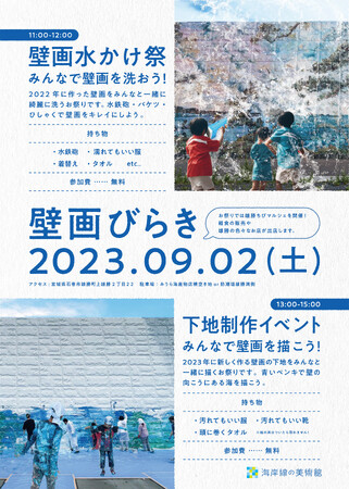 昨年制作した壁画を洗い、今年描く壁画の下地を参加者と描くワークショップイベントです。雄勝ちびマルシェも同時開催します。参加無料イベントです。ぜひ遊びにいらしてください。