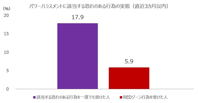 2.パワーハラスメントに該当する恐れのある行為を直近3カ月以内に「一度でも受けた」と回答した人は全体で17.9%、REDゾーン行為(※参照:【調査項目・指標概要など】)を受けた人は全体で5.9%であった。また、「一度でも受けた」との回答が多かったパワーハラスメントに該当する恐れのある行為の上位二つは下記の通りであった。