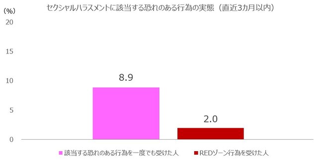 3.セクシャルハラスメントに該当する恐れのある行為を直近3カ月以内に「一度でも受けた」と回答した人は全体で8.9%、REDゾーン行為を受けた人は全体で2.0%であった。また、「一度でも受けた」との回答が多かったセクシャルハラスメントに該当する恐れのある行為の上位二つは下記の通りであった。
