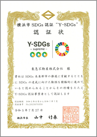 東急不動産株式会社(本社:東京都渋谷区、代表取締役社長:星野 浩明、以下「当社」)は、横浜市におけるSDGs達成に向けて取組む企業・団体等として横浜市SDGs認証制度「Y-SDGs」認証に申請し、最上位認証であるSupremeの認定区分での認定事業者となりましたのでお知らせいたします。