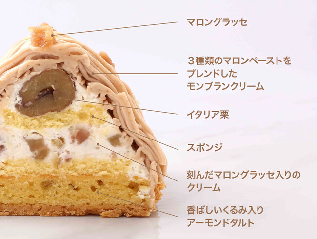 栗の甘みが凝縮したマロングラッセ入りの生クリームに香り高いイタリア栗を丸ごと重ね、3 種類のマロンペーストをブレンドした風味豊かな極細モンブランクリームをたっぷりと絞りました。