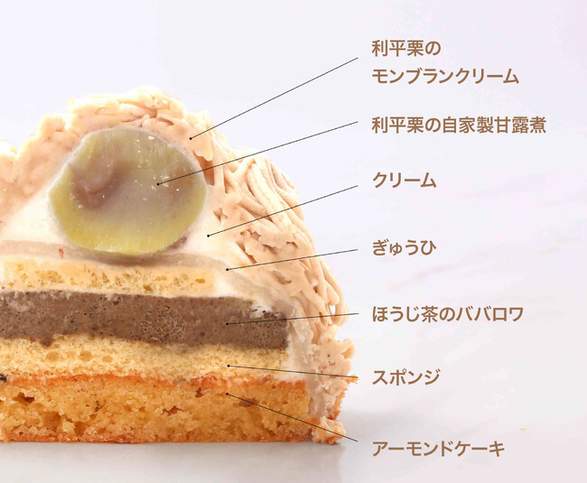 ほっくりとした利平栗の自家製甘露煮を、なめらかなモンブランクリームで包みました。上品な栗の甘みに合わせるのは、芳しい香りのほうじ茶のババロワともっちりとした食感のぎゅうひ、しっとり焼きあげたアーモンドケーキ。和素材の組み合わせが奏でる、豊かなおいしさをお届けします。
