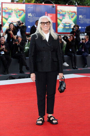 8月30日に開幕した、第80回ベネチア国際映画祭のオープニングセレモニーに登場した、映画監督のジェーン・カンピオン。マリア・グラツィア・キウリによるディオールのオートクチュール コレクションより、ブラックウールとシルクのダブルブレストタキシードにブラックレザーの「ディオール ボビー イースト ウエスト」バッグとブラックレザーの「ディオールアクト」サンダルを合わせた装いを披露しました。