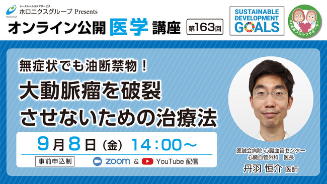 医療法人医誠会(大阪府大阪市 代表者:谷 幸治)では、第163回オンライン公開医学講座 『無症状でも油断禁物!大動脈瘤を破裂させないための治療法』を2023年9月8日(金)にオンラインで配信いたします。