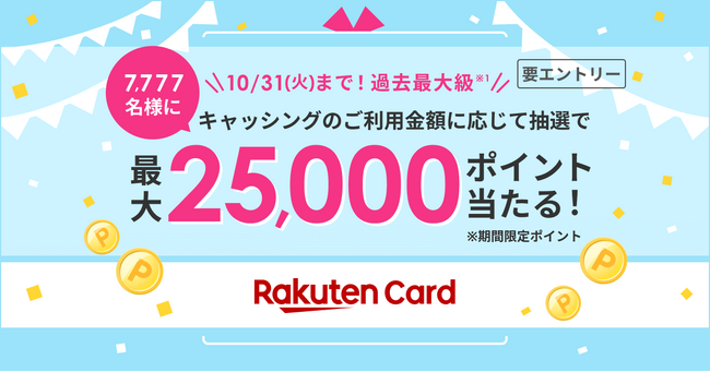 楽天カード株式会社(以下「当社」)は、本日9月1日(金)から「キャッシングは楽天カードで!合計7,777名様に抽選で最大25,000ポイント進呈!」キャンペーンを開始いたします。