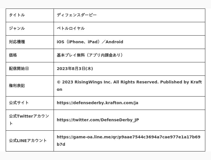 ・Google Play :https://play.google.com/store/apps/details?id=com.krafton.defensederby