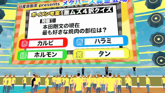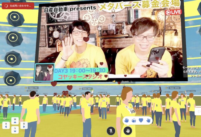 さらに、チャンネル登録者100万人超えのYouTuberコヤッキースタジオのトークライブや、名古屋発の人気グループ「BOYS AND MEN」は参加者参加型のクイズ大会を実施。サンシャイン池崎は、オリジナルエモート「ジャスティス」を500人以上のお客さんと同時に行う企画で会場を盛り上げました。募金エリアでは、タレントとお客様が至近距離で交流する、メタバースならではの取り組みを実施しました。
