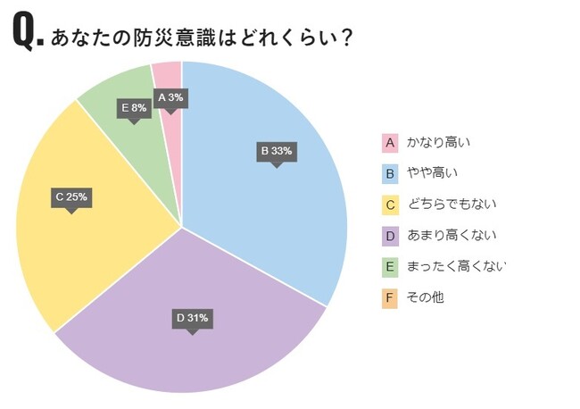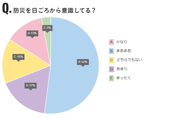 1位は「まあまあ」52%、2位は「あまり」17%、3位「どちらでもない」が15%でした。全体の7割弱の人は、ある程度の防災意識があり、2割の人があまり防災意識を持っていないことがわかりました。