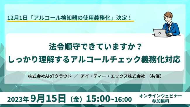 アルコールチェック管理サービス『スリーゼロ』(https://alc.aiotcloud.co.jp/)を提供する株式会社AIoTクラウド(本社:東京都江東区、代表取締役社長:松本 融、以下:AIoTクラウド)と、アイ・ティー・エックス株式会社(本社:神奈川県横浜市西区、代表取締役社長:野尻 幸宏、以下:アイ・ティー・エックス)は、アルコールチェック義務化対策として、企業担当者向けに、義務化の背景~対策ポイントまでまるごとご紹介する共催ウェビナーを9月15日(金)に開催いたします。