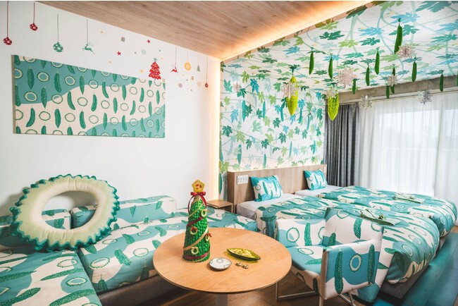 BEB5沖縄瀬良垣には、1室限定のユーモアたっぷりなゴーヤルームがあります。イベント期間はゴーヤルームもクリスマス仕様に大変身!ゴーヤの輪切りの形をしたクッションやオリジナルルームウェア、ゴーヤサングラスなどのゴーヤアイテムも用意しているので、ここに宿泊すれば、よりゴーヤクリスマス気分が盛り上がります。