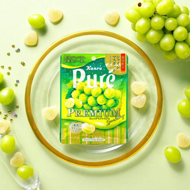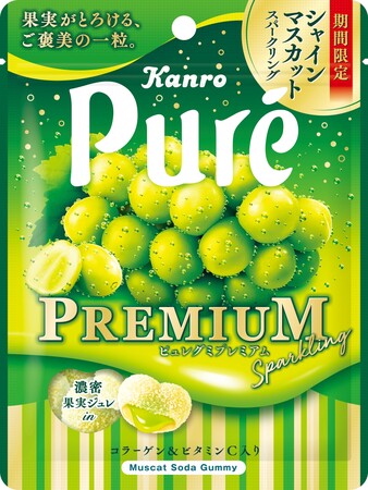 特徴 :芳醇な「シャインマスカット」味にスパークリング感を加えた、ご褒美のひと粒が楽しめるプレミアムなピュレグミ