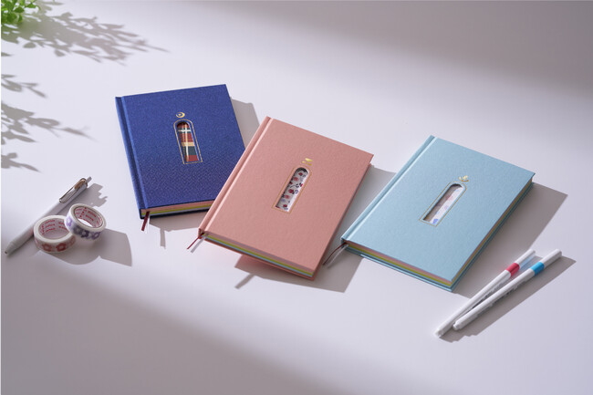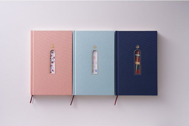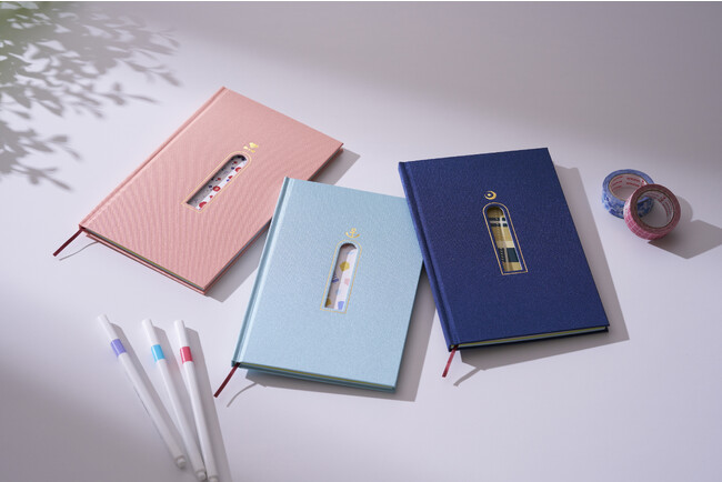 2023年9月4日(月)より、STORES・BASE・Amazonで発売開始!デザインを一新した「booco2024Diary」はつやのあるクロスに窓の形に抜かれた表紙。窓から見える見返しはそれぞれの部屋の壁紙をイメージしています。