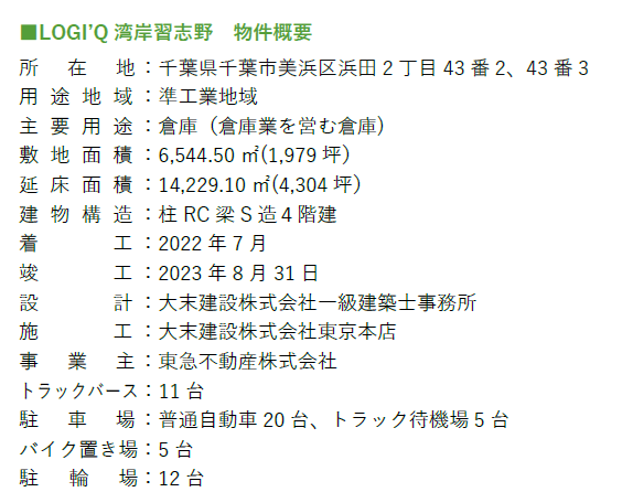 東急不動産株式会社(本社:東京都渋谷区、代表取締役社長:星野 浩明)は、シリーズ展開している物流施設『LOGI’Q(ロジック )』ブランド(http://www.tokyu-logiq.com/) において、 新たに3物件(「LOGI’Q湾岸習志野」、「LOGI’Q柏」2023年8月竣工、「LOGI’Q海老名南」2023年5月竣工)が竣工いたしましたのでお知らせいたします。