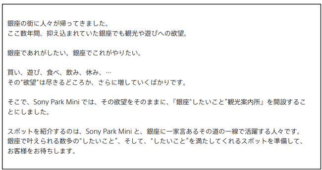 期間中も追加される “したいこと“ と、それを満たす100以上のスポットが詰まった「銀座“したいこと”観光案内リスト」は、Sony Park Miniと公式WEBサイトで公開します。