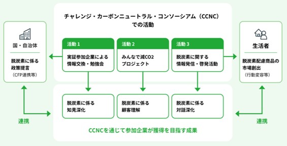 CCNCでは、生活者が脱炭素の取り組みに触れて認知を広げ、学びを通して楽しみ、興味をもって自分ゴト化する機会を用意し、生活者とともに脱炭素社会の実現に挑戦します。今後、1.実証参加企業同士の情報交換・勉強会、2.みんなで減CO2(ゲンコツ)プロジェクト、3.脱炭素に関する情報発信・啓発活動、の3つの活動を展開します。