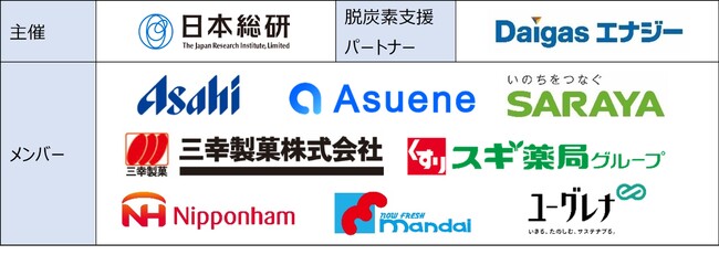 日本総研は活動全体の主催者としてコンソーシアムの活動全体を企画・推進します。Daigasエナジーは脱炭素支援パートナーとして脱炭素に係るソリューション提供や勉強会を主導します。また、アサヒGJ、アスエネ、サラヤ、三幸製菓、スギ薬局、日本ハム、万代、ユーグレナの各社は、商品や売場の提供、カーボンフットプリントの算定など各社の役割のもとコンソーシアム活動を展開します。