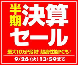 パソコン工房・グッドウィルを運営する株式会社ユニットコム(代表取締役:端田 泰三、本社:大阪市浪速区)は、パソコン工房WEBサイトにて、『半期決算セール』を2023年9月26日(火)13時59分までの期間限定で開催中です。