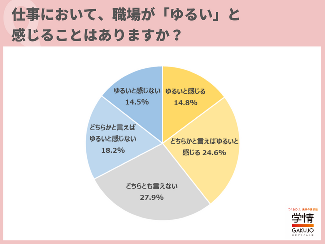 株式会社学情(本社:東京都千代田区)は、20代の仕事観や働く意識をひも解くために、アンケート調査を実施しました。今回は、「ゆるい職場」に関して調査。職場が「ゆるい」と感じることがあるとした20代が4割に迫りました。「ルーティーン業務ばかりで、なかなか成長できない」「数字へのコミットを重視されておらず、成果を上げても、上げなくても評価が変わらない」「上司から指導されることがない」といった声が寄せられています。職場が「ゆるい」と感じる点は、「上司からの指導がない」が最多。次いで、「雑用が多い」、「責任ある仕事を任されない」が続きました。