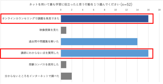 一番多かった回答が同率で“オンラインカウンセリングで課題を発見できた”・ “講師に分からない点を質問した” という結果でした。