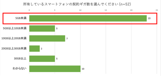そこで、生徒が所有しているスマートフォンの契約ギガ数を聞いたところ、5GB未満での契約が一番多い結果でした。