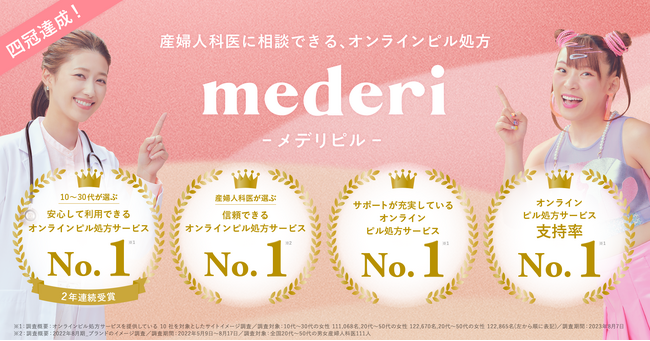 mederi株式会社(東京都目黒区、代表取締役:坂梨 亜里咲、以下当社)は、オンラインピル診療サービス『mederi Pill(メデリピル)』が、オンラインピル処方サービスに関するブランドイメージ調査にて、4つの部門でNo.1に選出されましたことをお知らせします。