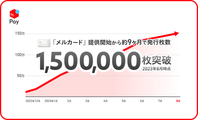 株式会社メルペイ(以下、メルペイ)は、2022年11月8日より、「メルカリ」の利用実績等で限度額が決まり、アプリで利用と管理が完結するクレジットカード「メルカード(※1)」の提供を開始し、すべてのお客さまが申込可能となってから(2022年12月1日)、約9ヶ月(※2)でカード発行枚数150万枚を突破したことをお知らせいたします。
