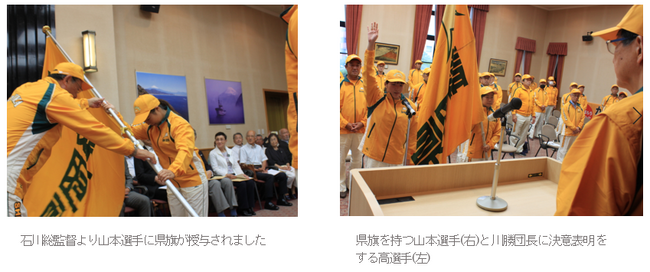 国体開幕に先立ち選手団の結団式が6日、静岡県庁で行われ、静岡県選手団の団長である川勝 平太県知事および総監督である石川 惠一朗氏から山本選手に県旗が授与されました。