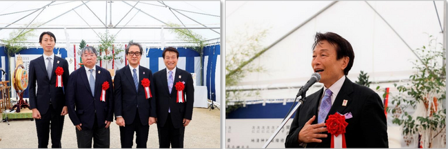 「地鎮祭」には、公益社団法人2025年日本国際博覧会協会 事務総長 石毛博行氏のほか、パビリオンのエグゼクティブプロデューサーを務める大阪大学名誉教授 澤芳樹氏、パビリオンの建築デザインを手掛ける建築家 板坂諭氏など来賓の方々に加え、パソナグループ代表 南部靖之をはじめパソナグループ関係者、工事関係者など、総勢30名が参加。兵庫県淡路市の伊弉諾神宮 宮司のもと、工事の安全を祈願し「地鎮祭」が厳粛に執り行われました。