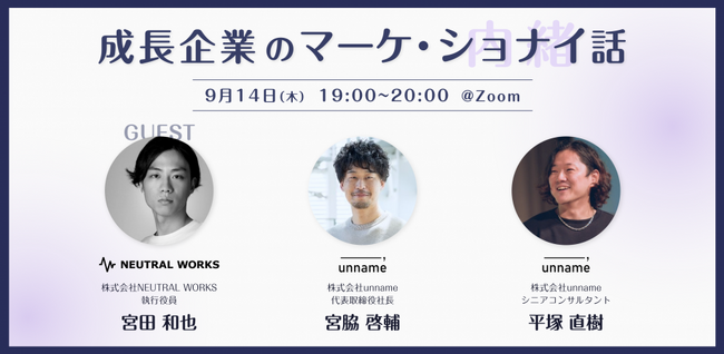株式会社ニュートラルワークス(本社:神奈川県茅ヶ崎市 代表取締役:三木五月、以下 ニュートラルワークス)は、マーケティングの側面から事業成長を支援する、株式会社unname(本社:東京都渋谷区、代表取締役:宮脇 啓輔、以下「unname」)主催のウェビナーに登壇いたします。