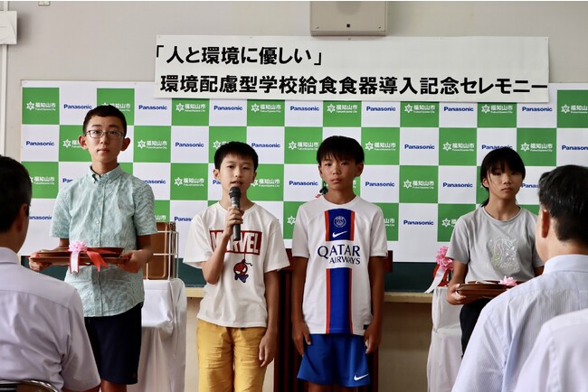 9月4日、福知山市立惇明小学校にて、「人と環境に優しい」環境配慮型学校給食食器導入を記念するセレモニーを開催しました。福知山市長と教育長、パナソニック ホールディングス株式会社の小原本部長とパナソニック プロダクションエンジニアリング株式会社の柳本代表取締役社長から新食器を贈呈された小学生は、「間伐は二酸化炭素を減らしたり、土砂崩れを予防することを学びました」「開発に関わった皆様に感謝し、森林環境の大切さや木材の命のありがたさを感じながら、食器を大切に使って給食を食べたいです」とお礼の言葉を述べました。