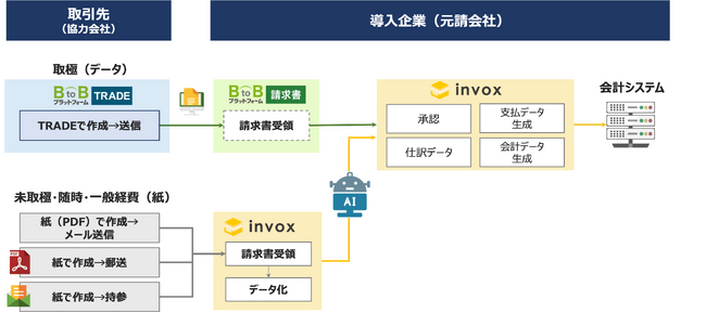 さらに「invox」と「BtoBプラットフォーム TRADE」「BtoBプラットフォーム 請求書」を併せてご利用いただくことで、建設業でやり取りされる「取極」「未取極」「随時取引」「一般経費」等、全ての請求書のデジタル化が100%実現します。