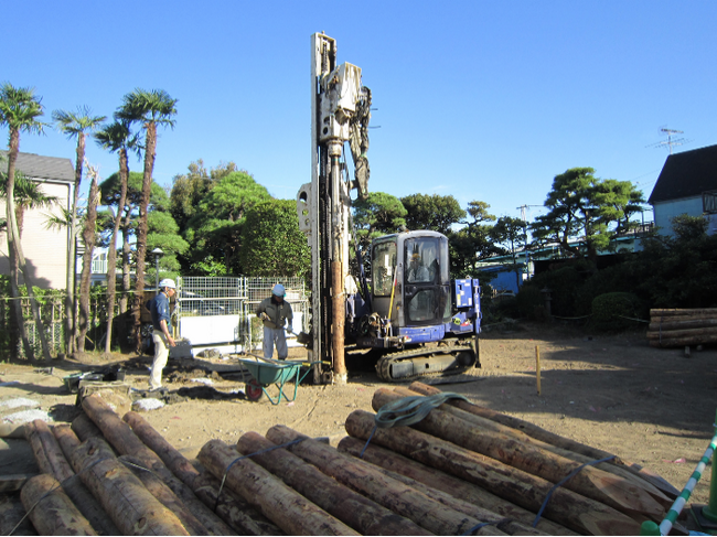 ・丸太の本数を増やして密に配置すると液状化対策にもつながります(LP-LiC工法、第一号物件で採用)。