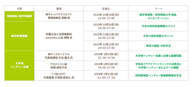 広域TLOである(株)キャンパスクリエイトが提供する研修プログラムを通して、産学官連携のスキルアップを目指しましょう!