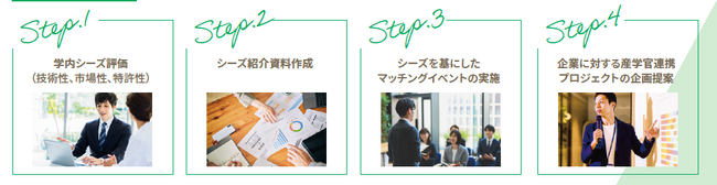 学内シーズの発掘・評価から企業へのプロジェクト提案までの基本的なフローを行います。