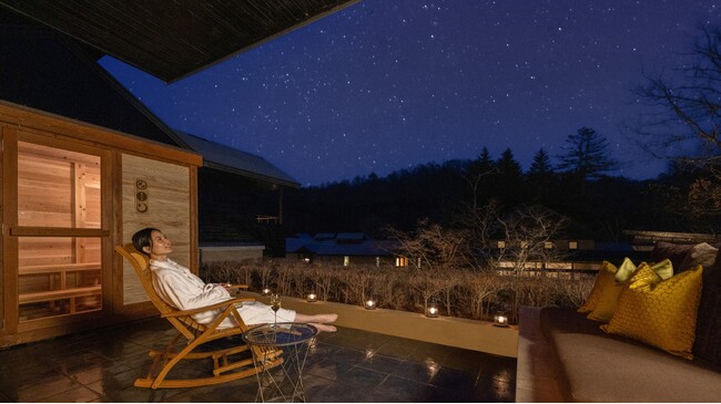本プログラムでは、テラスに中温高湿のサウナが設置された特別な客室を用意します。サウナは熱と蒸気によって体を深部から温める「ウェットサウナ」方式で、高湿の水蒸気を発生させる「ロウリュ」も可能です。また、外気浴を楽しめるよう、テラスにグラビティチェアを設置します。テラスからは満天の星空や霧氷など冬の軽井沢の情景を望むことができ、周囲からは見えないよう配慮もなされているため、プライベートな空間で開放的な外気浴を楽しめます。また、客室風呂の水は浅間山の伏流水です。この水は軟水で皮膚刺激が少ないので、外気浴後にぬるめの温度で入浴することで乾燥しがちな肌をいたわることができます。