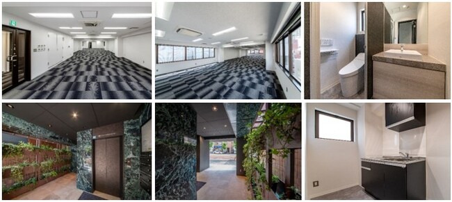 本物件は、黒のタイルを基調とし、グリーンのアクセントが入った大理石調タイルが高級感を演出している外観のほか、壁面緑化、衛生器具を一新したレストルームなど、バリューアップ工事を施しています。
