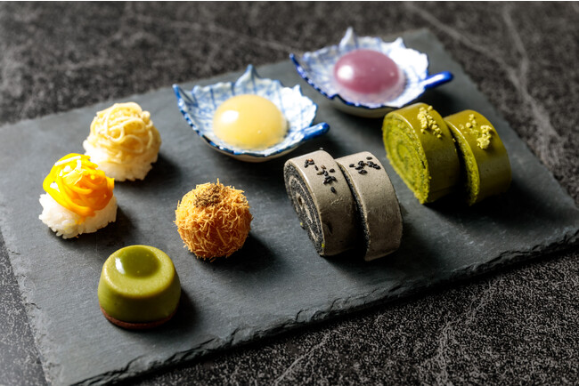 フルーティーで花のような香りが楽しめる静岡県産の和紅茶を使用した「洋梨と和紅茶のムース」、深い味わいと濃い香りが特長の滋賀県朝宮のほうじ茶を使用した「カリフラワーとほうじ茶のブランマンジェ 柿のアクセント」など