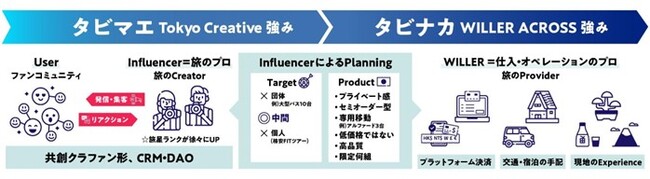 本事業は、WILLER ACROSSとTokyo Creativeが連携し、全国各地にある魅力ある観光コンテンツから、外国人インフルエンサーが「行きたい」「見たい」「体感したい」と感じる素材を独自目線で組み合わせ、オリジナルのツアー企画・販売を実現するプラットフォーム事業です。