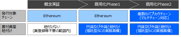 仲介者が日本国内でステーブルコイン(電子決済手段)を業として取り扱うためには、改正資金決済法で新設された「電子決済手段等取引業」のライセンスを取得する必要があります。法律施行から“1号業者”が新たにライセンスを取得するまでに概ね1年を要する(2024年6月頃)と想定し、「商用化Phase1」を2024年前半に実現することを目指します。