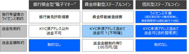 2023年6月施行の改正資金決済法上、ステーブルコイン(電子決済手段)として、「銀行預金型[2]」・「資金移動型」・「信託型」の3類型が想定されていますが、以下のような特徴があるため、現時点で最も柔軟な設計が可能な「信託型」でのステーブルコイン組成を前提としています。
