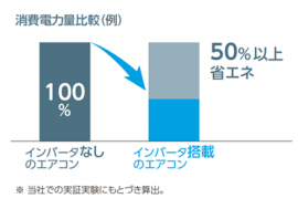 インバータとは、電圧・電流・周波数を制御する技術です。インバータを搭載したエアコンは、エアコンの心臓部である圧縮機のモータを的確にコントロールします。さらに従来のモータや熱交換器に改良を加えることで、インバータなしのエアコンに比べて50%以上の消費電力を削減できます。