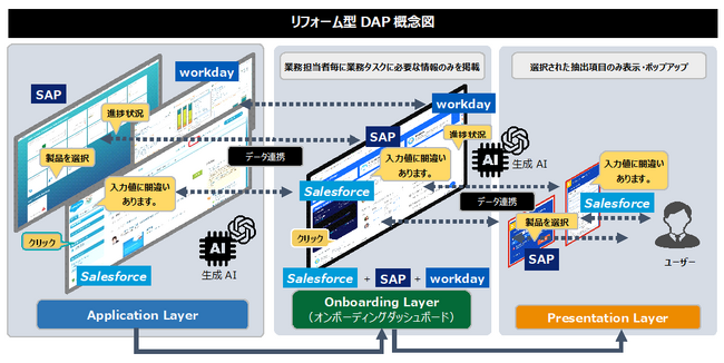 そこで、マイメタ社は「リフォーム型DAP」として日本展開をスタートさせ、上記の様々なお客様の課題を解決するソリューションとして既存システムの操作性、視認性を最大限に便利にできる機能を搭載したDAPの提供を開始いましました。その主な特徴は、1.UI/UXの観点で既存システムの画面レイアウトや操作手順を大きく変更できる、2.他の業務アプリとの連携により1つの画面で情報提供が可能になる、3.生成AIと連携させ、情報入力の自動化と簡素化を提供することで業務プロセスの革新が可能となる、というものです。