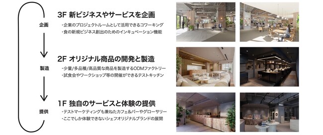 「職・住・遊 近接の新しいライフスタイル」を提案する「フォレストゲート代官山」に拠点を設けることで、商品企画や製造という機能的な価値だけではなく、食文化やライフスタイルを豊かにする創造的なサービスづくりを展開していきます。2階ODMファクトリーを中心に、隣接するテストキッチン、1階のカフェ&バーやグローサリー&ワインショップ、パティスリーショップ、3階のビジネスエアポート代官山がゆるやかに連携しあうことで、企画・製造・提供というサイクルを循環させながら、活力のあるヒト・モノ・コトが集まり、つくり手とお客様との共感を醸成させていくプロセスエコノミーへと成長させていきます。