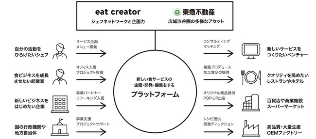 東京を中心に飲食店運営、施設プロデュースやブランディング等、食の領域で多様なサービスを展開するイートクリエーターの「シェフネットワーク」や「企画力」と、広域渋谷圏において「働く」「遊ぶ」「暮らす」が融合した持続性あるまちづくりを目指す東急不動産の「多様なアセット」を掛け合わせていきます。これからの社会課題や環境変化に対応しきれない従来のビジネスモデルを超えて、食に関わる人やコミュニティ、企業や自治体をつなげるハブとなり、それぞれがプロジェクトベースで活動し、相互連携を図りながら新しい食サービスの企画・開発・編集をするプラットフォームを目指します。