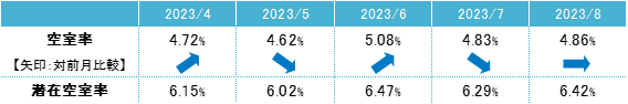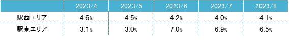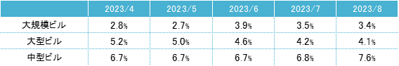 空室率は前月比プラス0.03ポイントの4.86%となり、前月からほぼ横ばいだった。8月に竣工した新築ビルがまとまった面積の空室を抱えて竣工した一方、統合や拡張移転等で成約し、わずかな動きに止まっている。規模別では「中型」が前月比プラス0.8ポイントと大幅に上昇した。潜在空室率は前月比プラス0.13ポイントの6.42%だった。拡張移転や新規開設等の前向きな需要に加え、建替えに伴う移転需要もあり、主要エリアでは既存ビルの募集床が品薄な状況となっている。